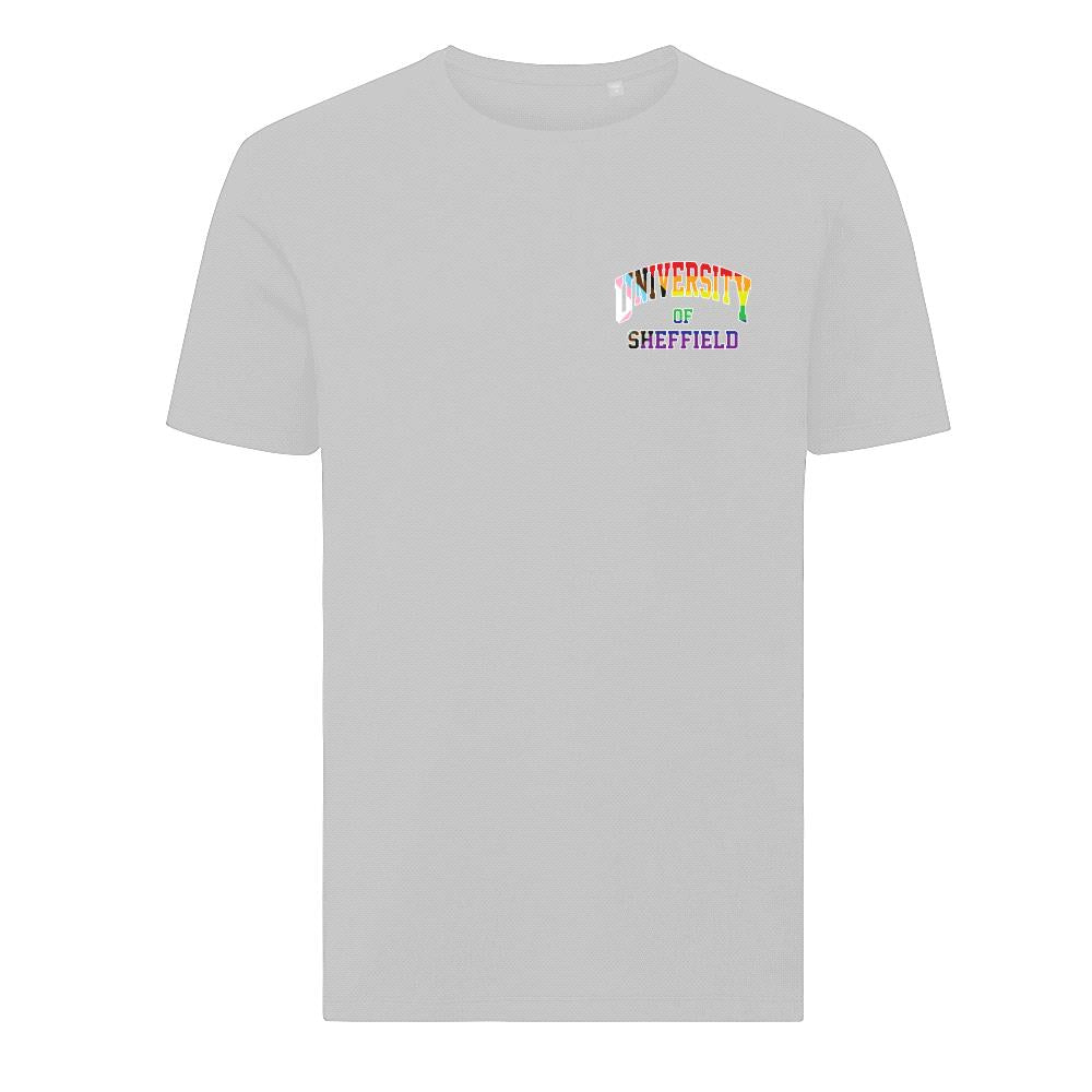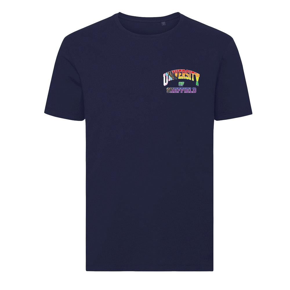Represent your university in style with this University of Sheffield t-shirt. Made from soft and comfortable 100% organic cotton fabric (Navy/Grey - Purple 100% Cotton) , this tee is perfect for everyday wear. Featuring the iconic University of Sheffield USA print to the left chest as worn, in the colours of the progress pride flag - 6 rainbow colours + the Black Lives Matter and Transgender flag colours, proudly displayed on the front.
